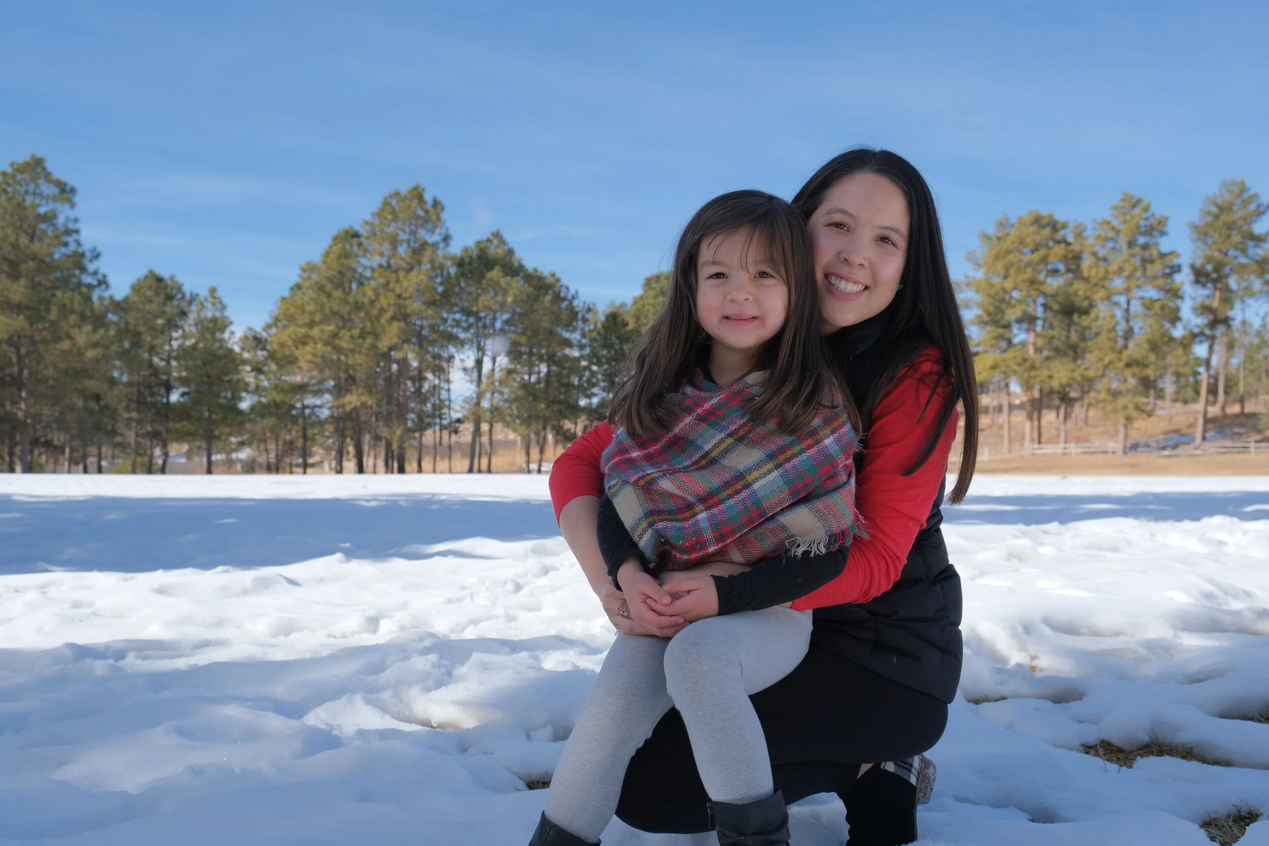 A woman and a young girl sit on snow-covered ground outdoors, smiling at the camera with trees and blue sky in the background.