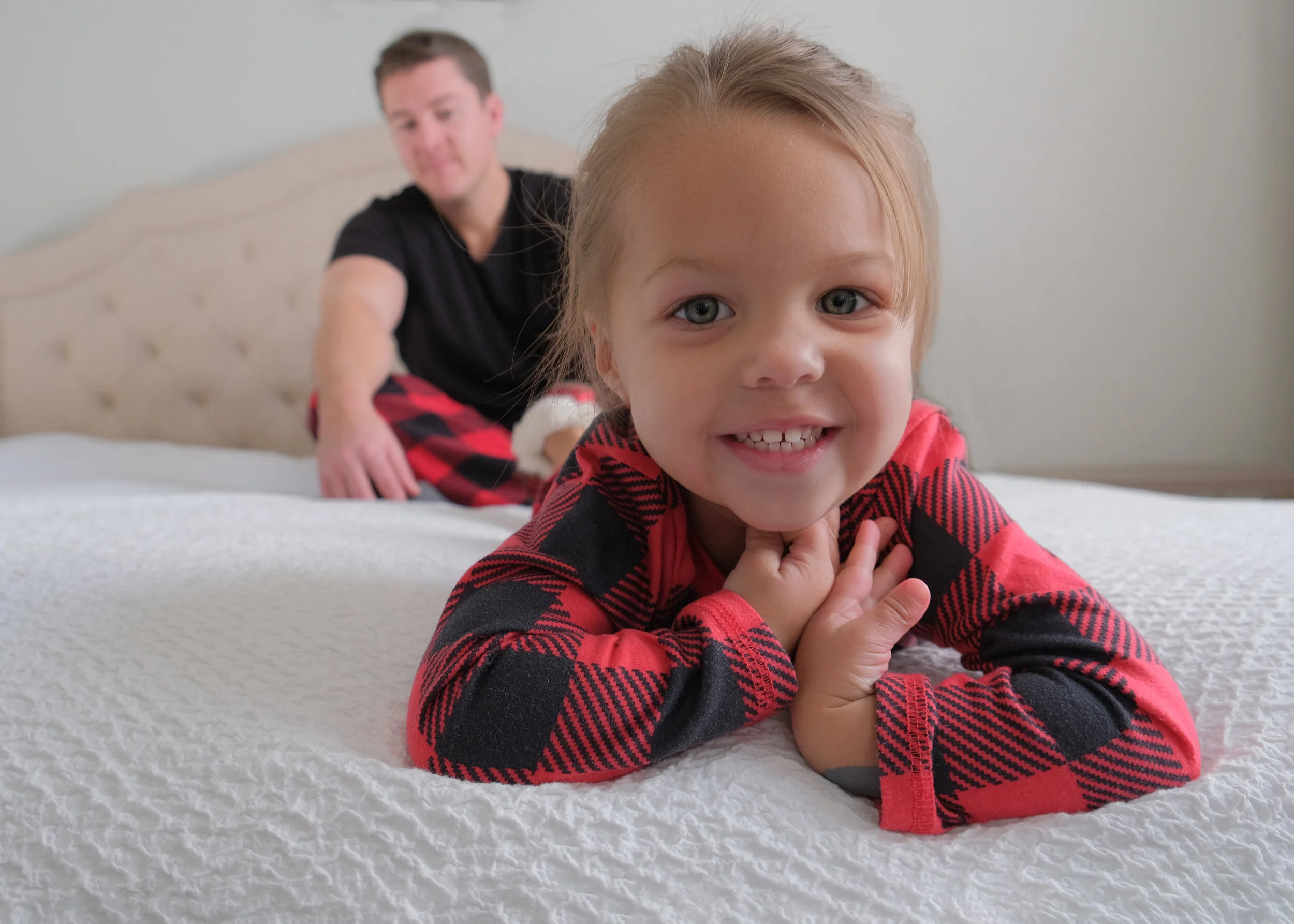 A young girl with blonde hair and blue eyes lying on a bed, smiling with a man in the background, both wearing red and black plaid pajamas.