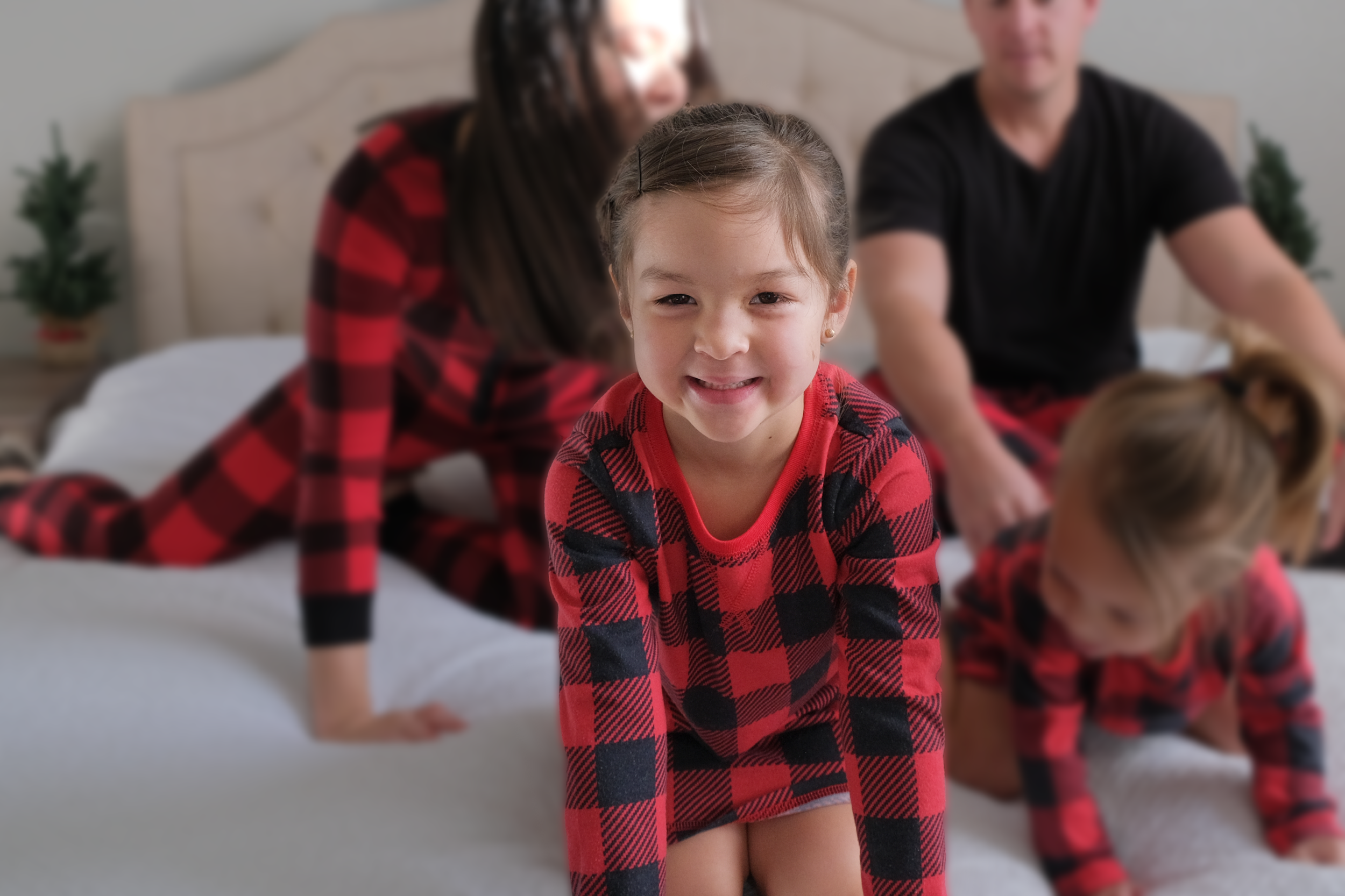 A young girl smiling on all fours on a bed, with two other children and an adult in the background, all wearing matching red and black plaid pajamas, in a cozy bedroom decorated for Christmas.
