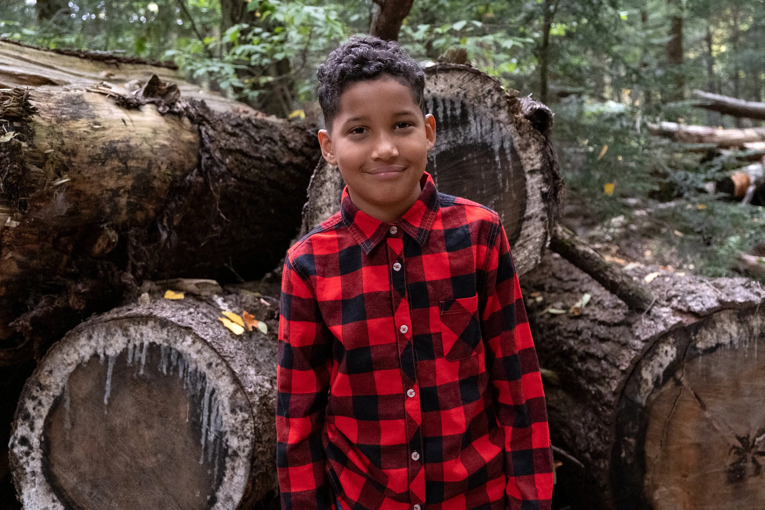 Smiling young boy with curly hair wearing a red and black plaid shirt standing in front of stacked cut logs in a forest setting.