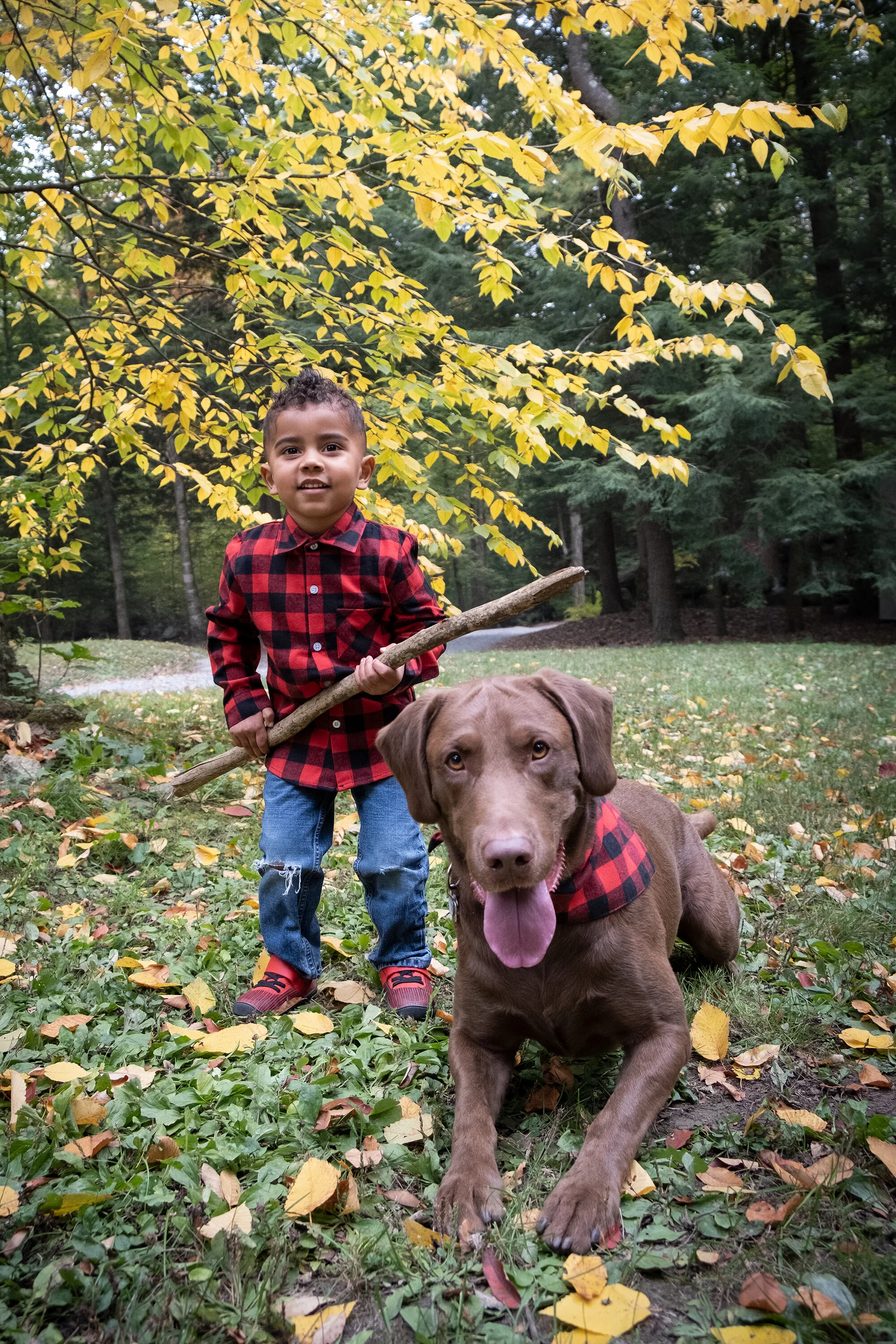 A young boy with a curly haircut wearing a red and black plaid shirt and jeans holding a stick, standing next to a brown Labrador retriever in a park with green grass, fallen leaves, and trees with yellow and green leaves. View fullsize