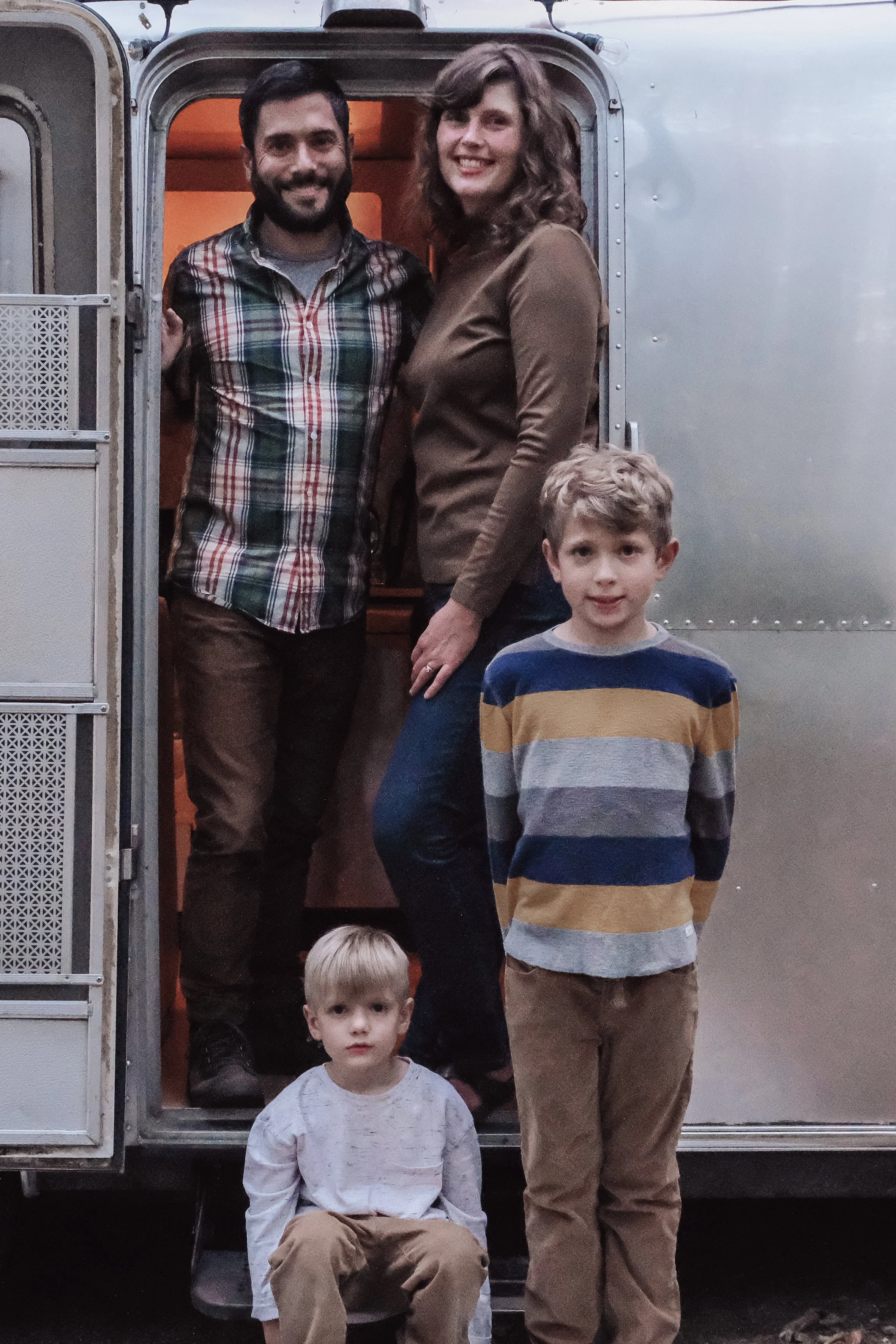 A family of five, including two adult women, two young boys, and a man, standing at the door of an Airstream trailer. The woman with curly hair is smiling, and the man with a beard is also smiling. The children, one with blonde hair sitting on the gr