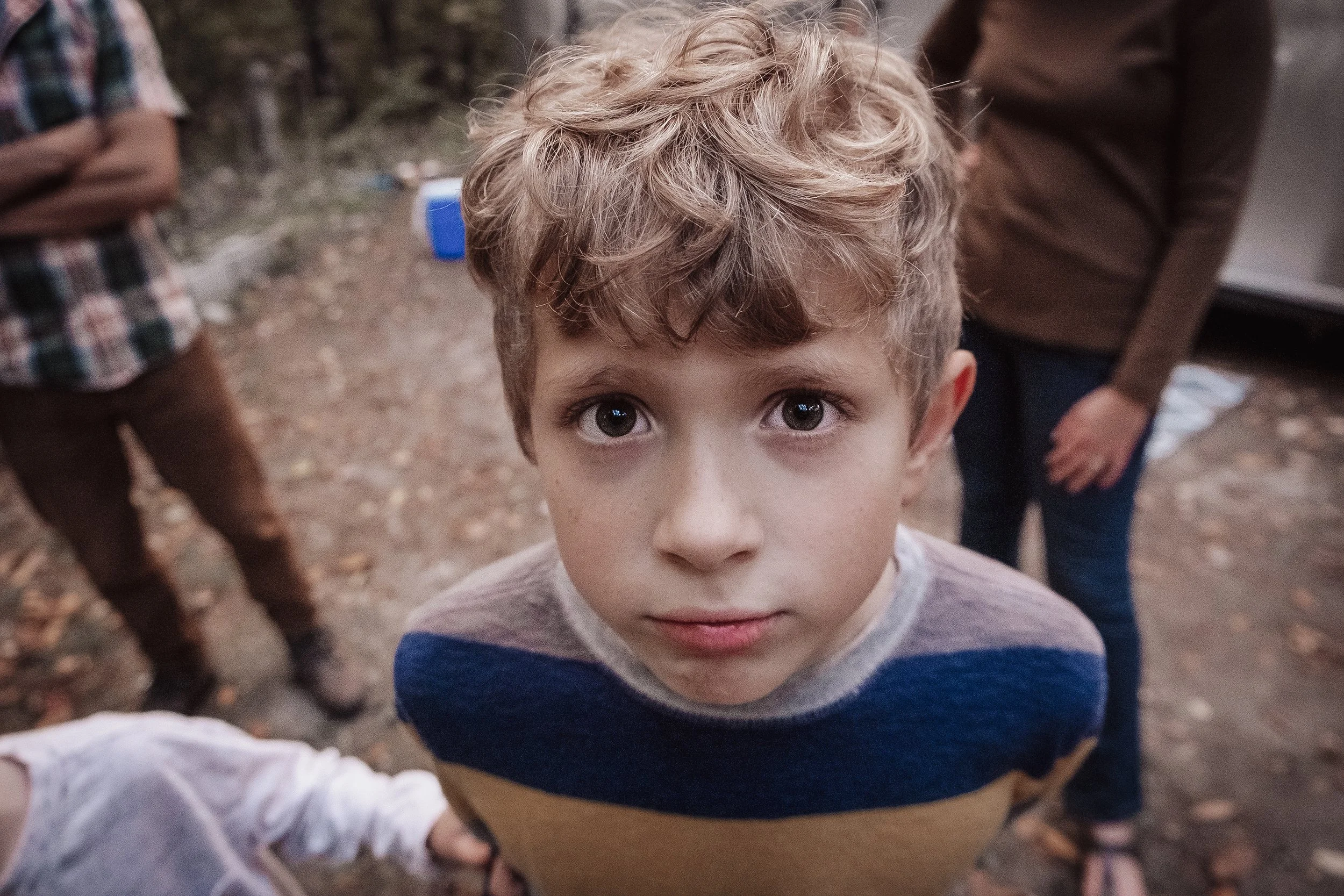 Close-up of a young boy with curly blonde hair and blue eyes looking directly into the camera, in an outdoor setting with other partially visible people around him. View fullsize